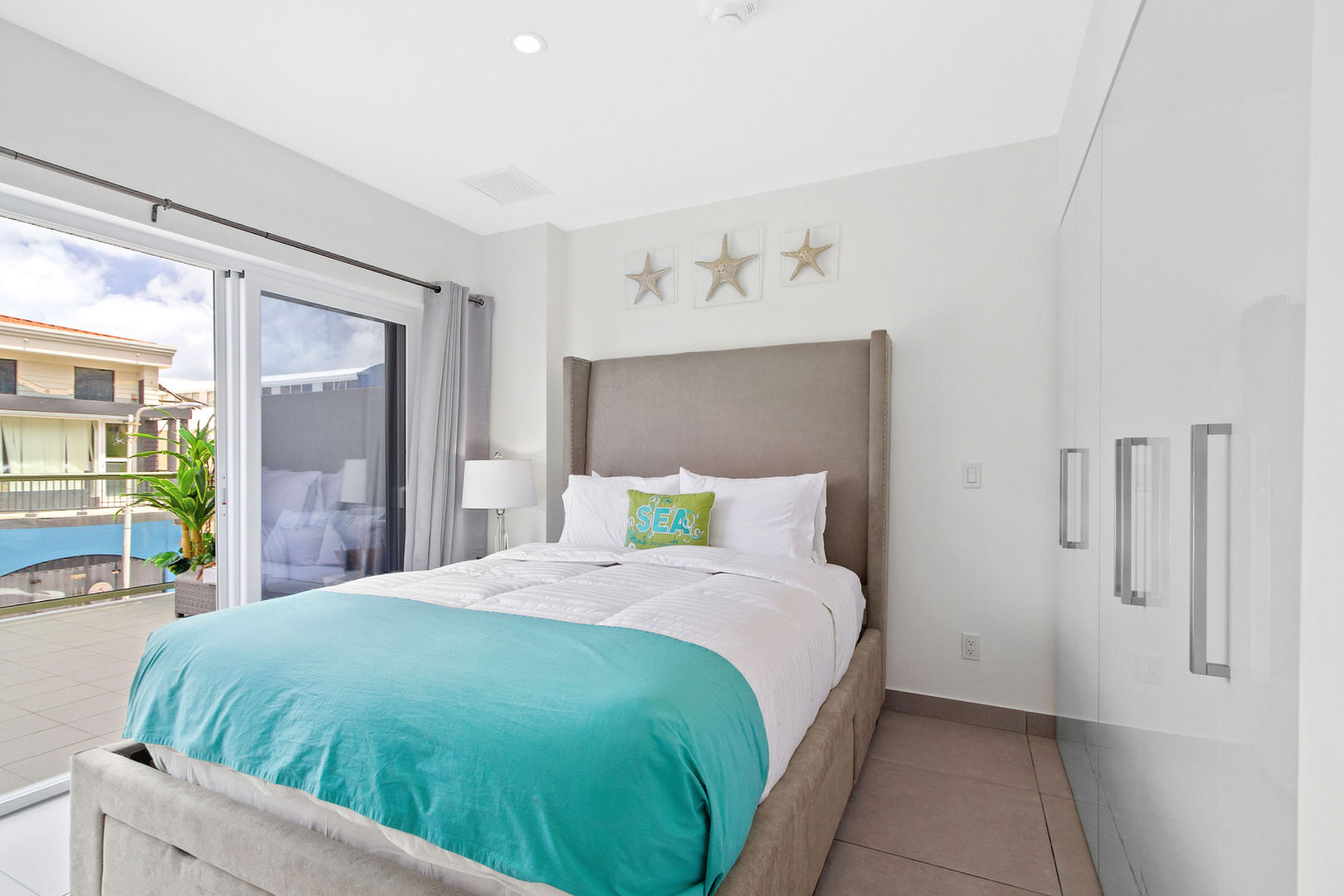 The open layout leads to an oversized private balcony where you’ll find a hammock, BBQ grill, and seating area — ideal for soaking in the partial ocean views and the lively downtown energy.